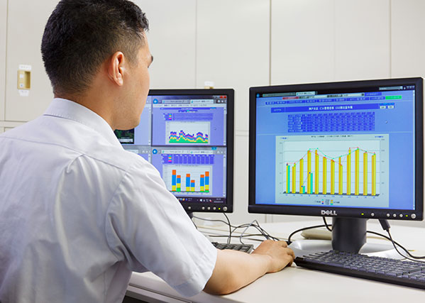 システムソリューション部では、プロセスオートメーション(PA)とファクトリーオートメーション(FA)の設計・製作・保守メンテナンスを、少数精鋭で施工しています。PA業務の主軸は、工場やビルなどの電気・水・温度などを監視・制御する「エネルギー監視制御システム」と、ダムに流入する水量などを監視する「ダムの防災情報管理システム」。FA業務の主軸は、自動車工場などで使用される鋼材や半導体材料の汚れや傷を調べる「検査装置」です。PAもFAも、各種プログラミング言語を使用してデータ処理を行い、最適な動作環境を実現。特にFAは3次元CADを使用して機械設計を行い、かんでんエンジニアリング独自製品を製作しています。