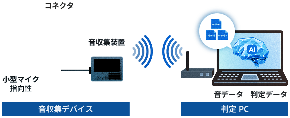 コネクタ嵌合音や切断音など、一瞬だけ発生する動作音をAIが解析し、正常をリアルタイムに判定します。音の大きさだけに反応するのではなく、周波数特性や時間的変化といった音の特徴そのものを学習することで、工場内のさまざまな騒音環境下でも安定した検知を実現。